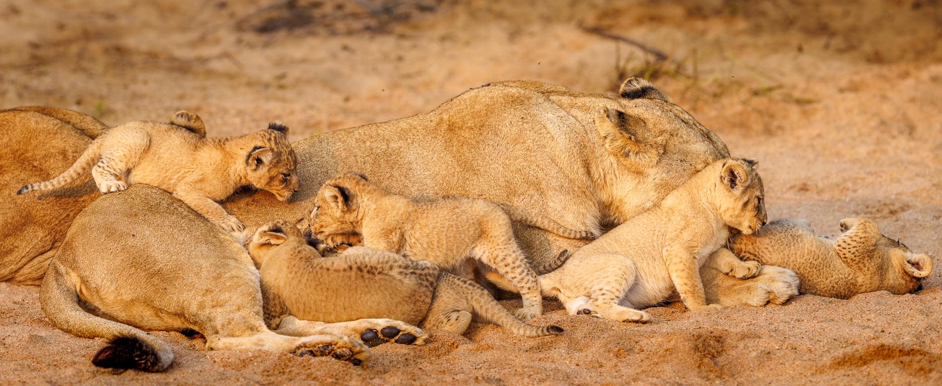 It was a bit of a wait, but after a couple of sightings some lucky guests had of the Sark Breakaway lionesses moving their cubs to a new den site, the little ones started popping out which was our cue from the mothers that we could get a bit closer and get our first proper view of them! Seven new cubs were introduced by the mothers – three 6-week old cubs, and four cubs born a few days later. My initial assessment was that there are two males and four females – a good number to help the pride should the females survive until adulthood.